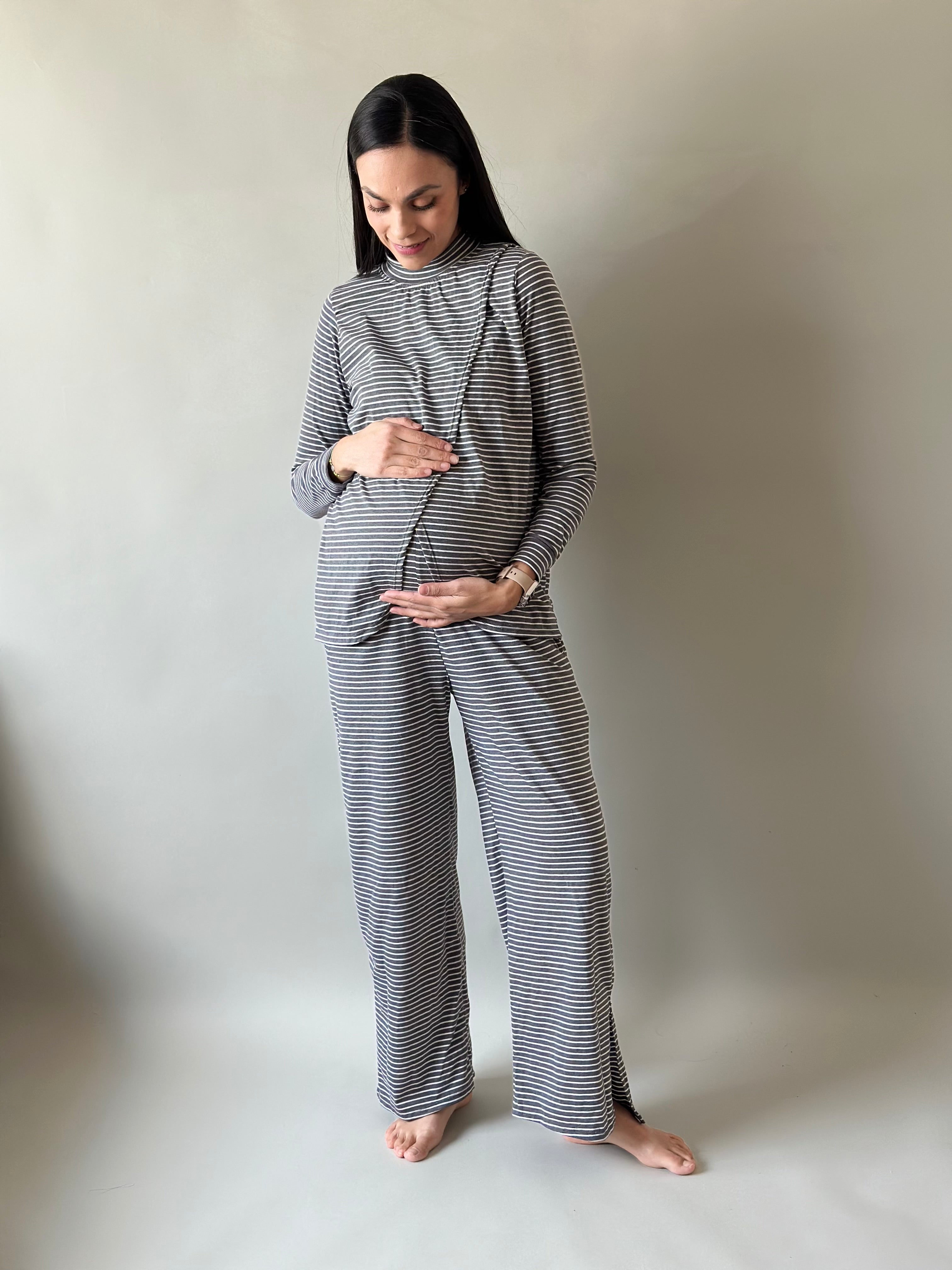 Blusa de corte holgado con fácil acceso al frente para lactancia y pantalón recto holgado con elástico en la cintura para que lo uses todo el tiempo en postparto.