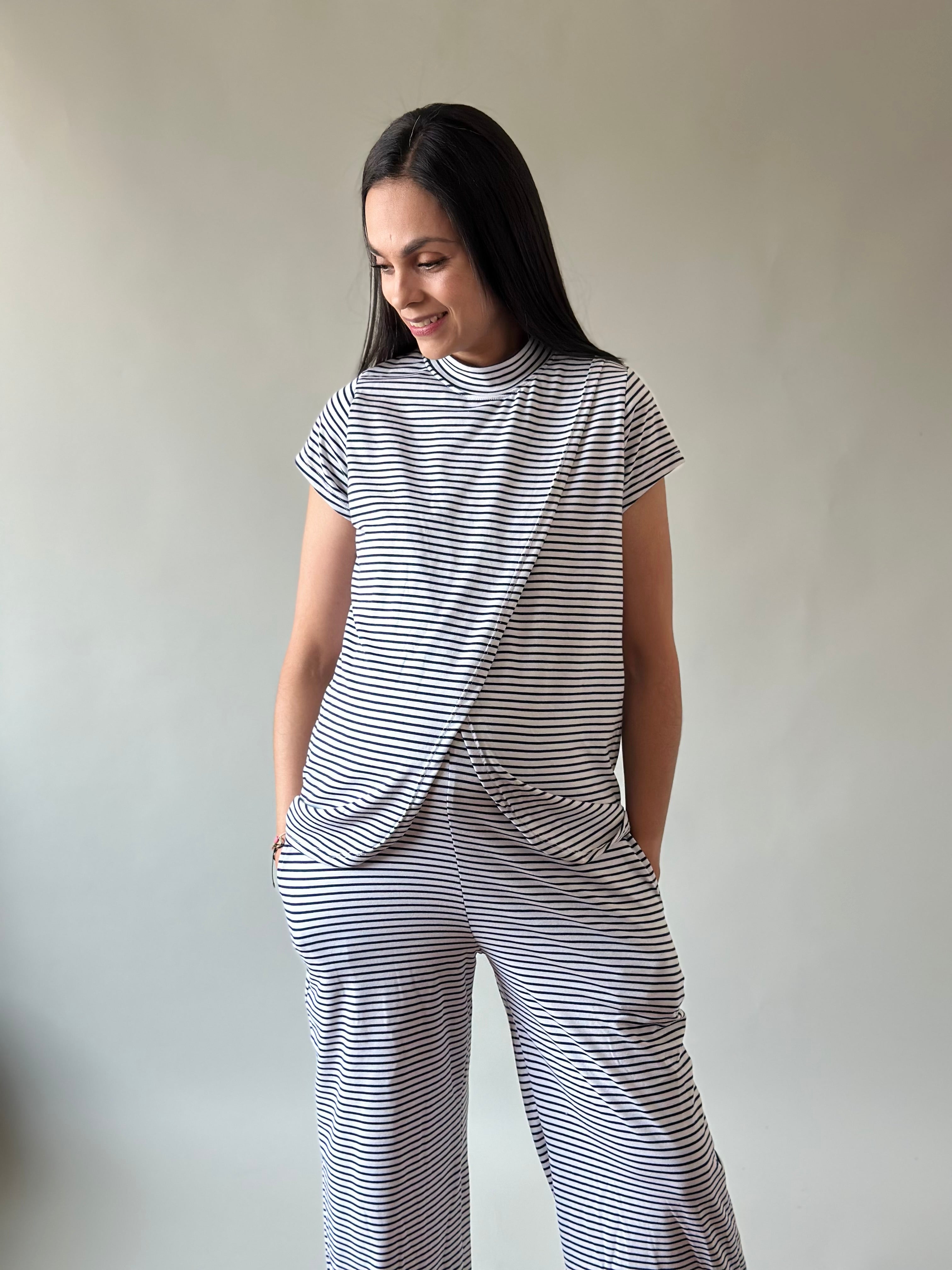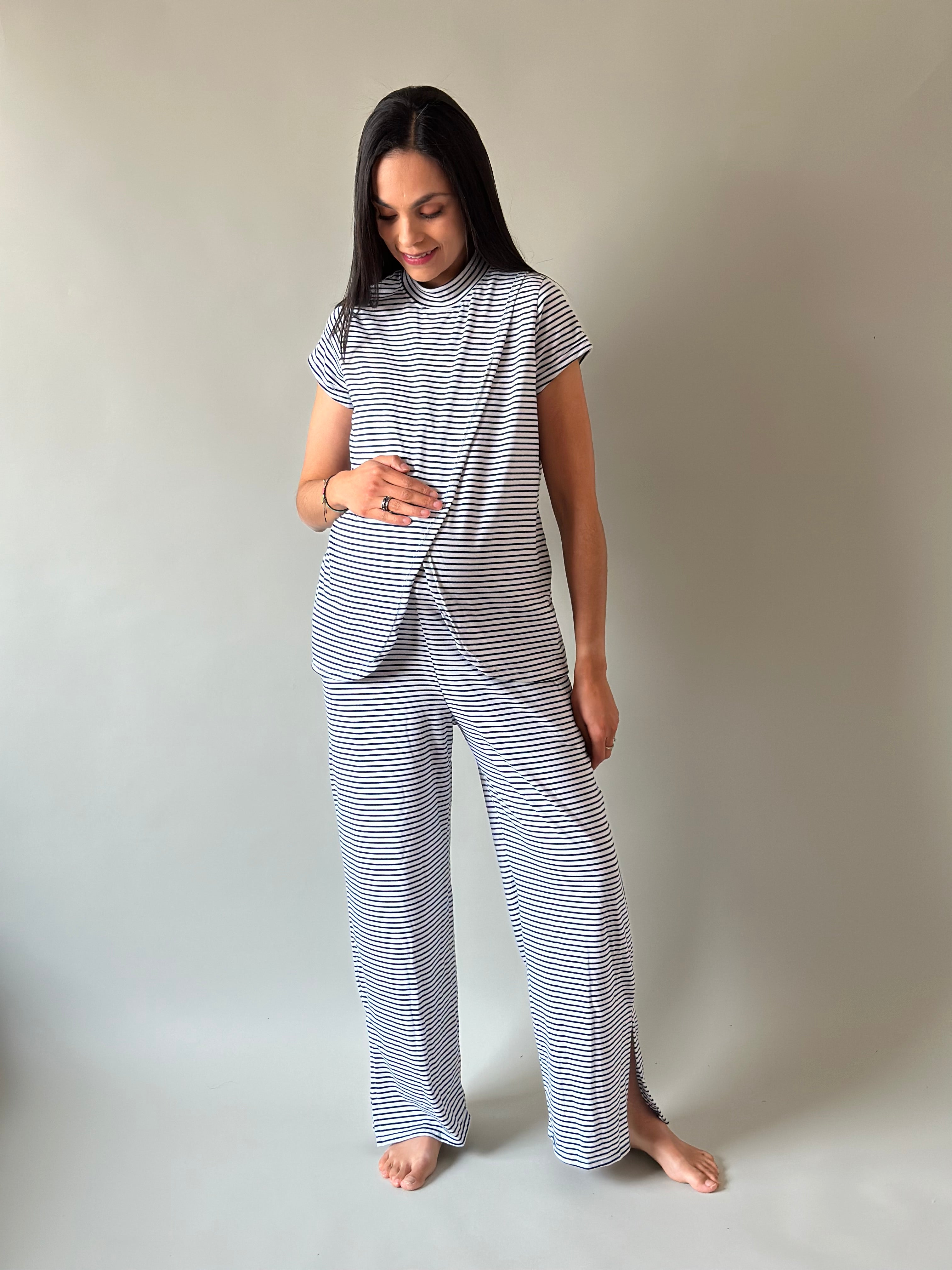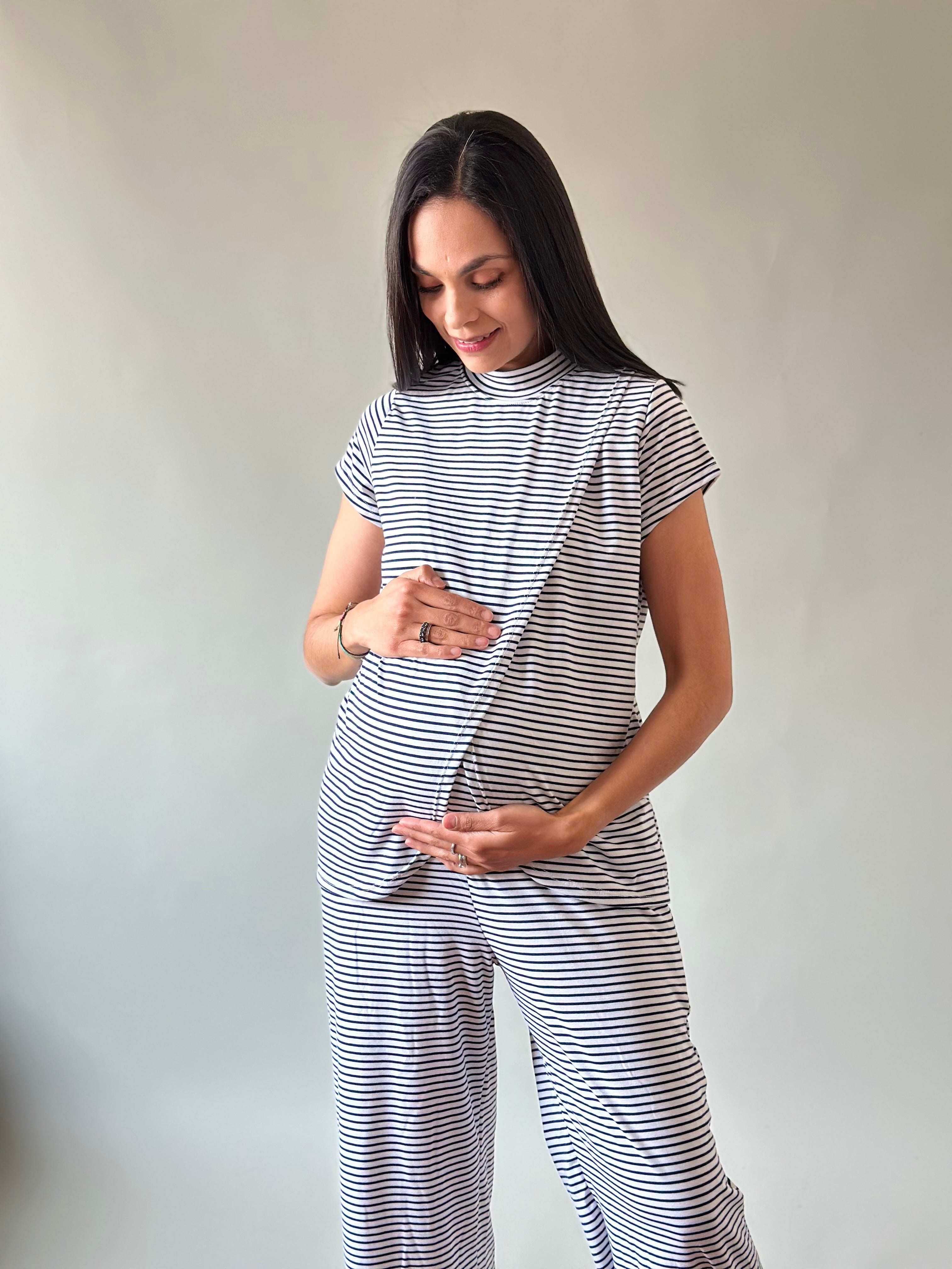 Blusa de corte holgado con fácil acceso al frente para lactancia y pantalón recto holgado con elástico en la cintura para que lo uses todo el tiempo en postparto.