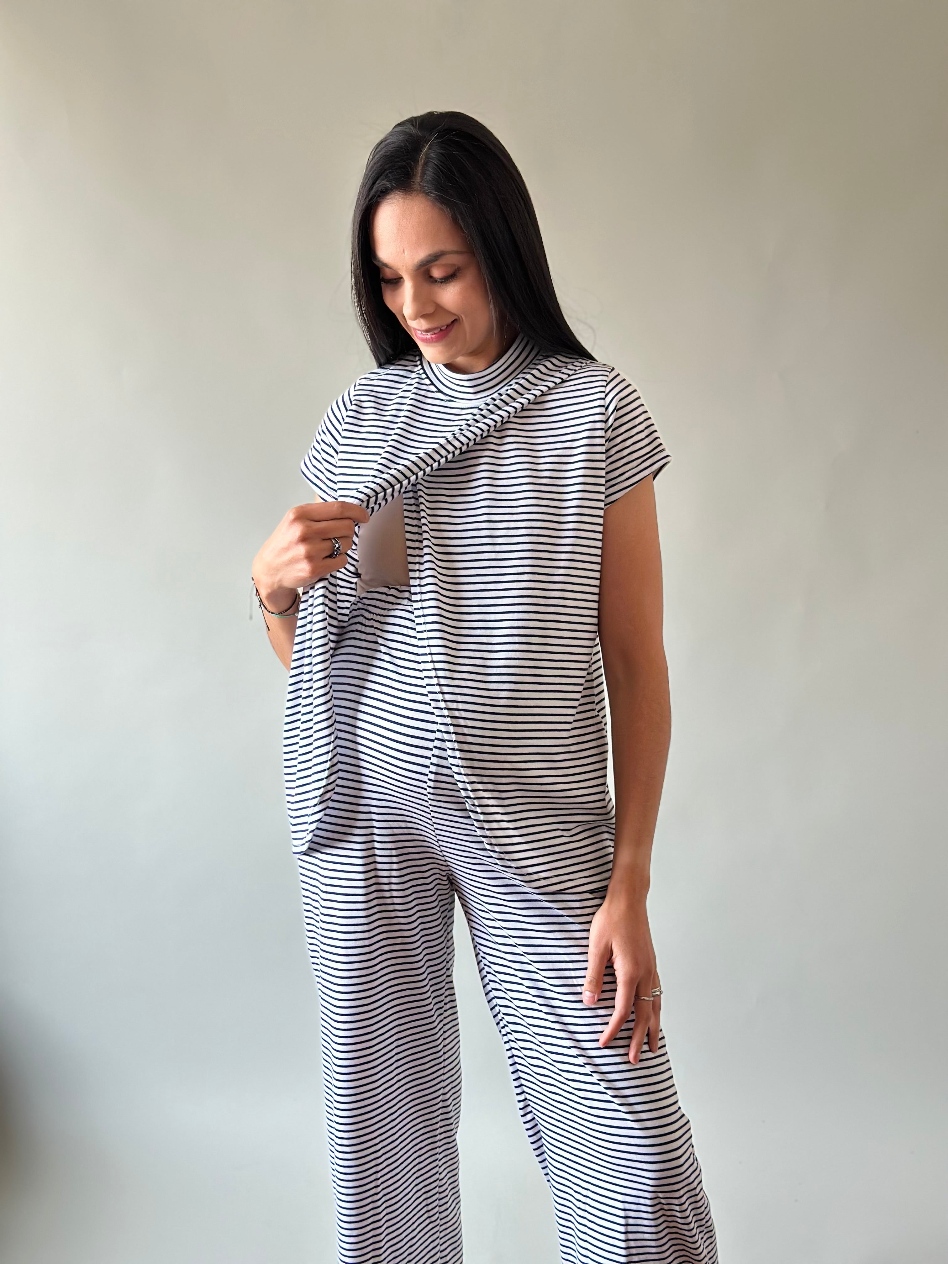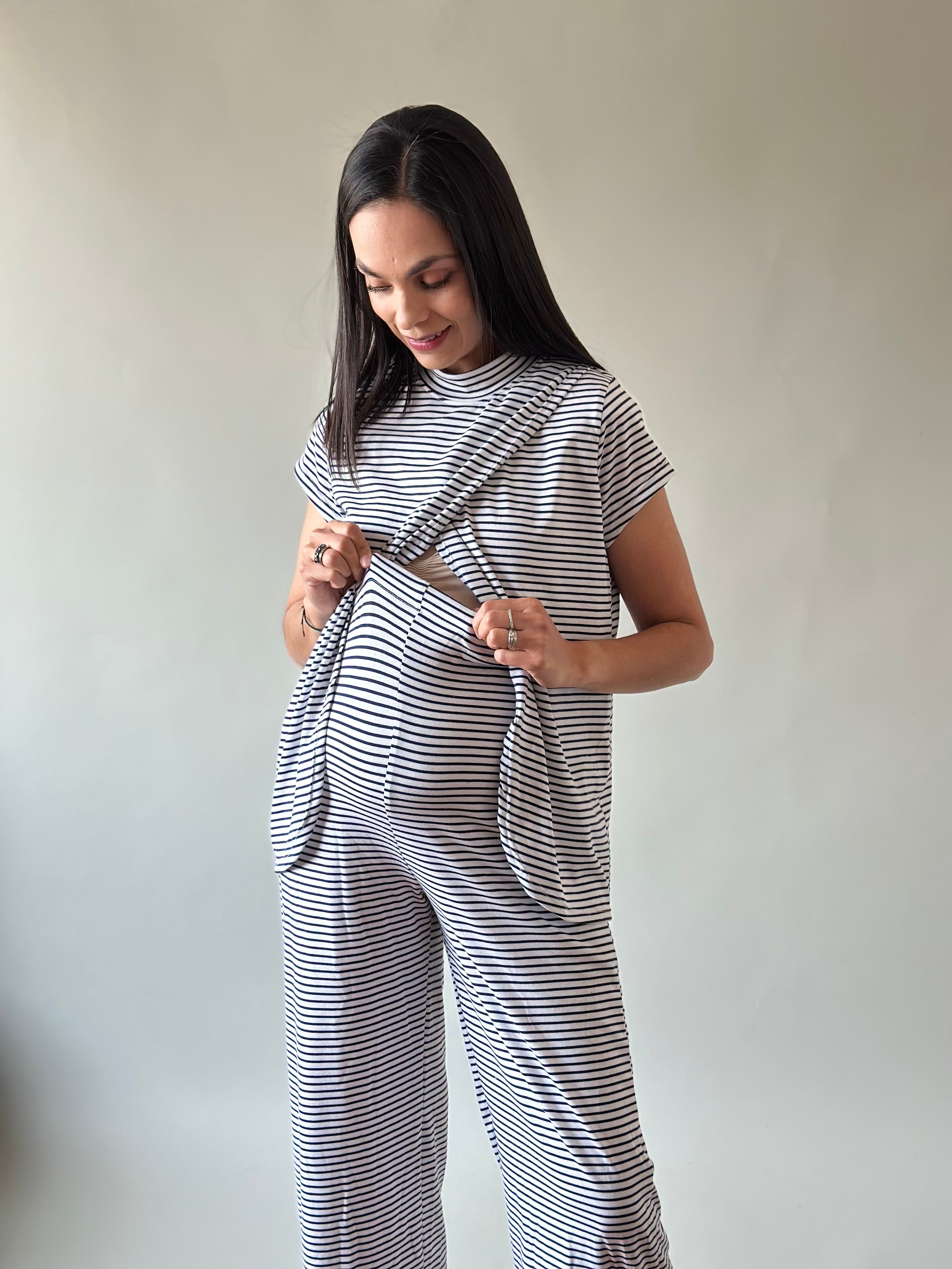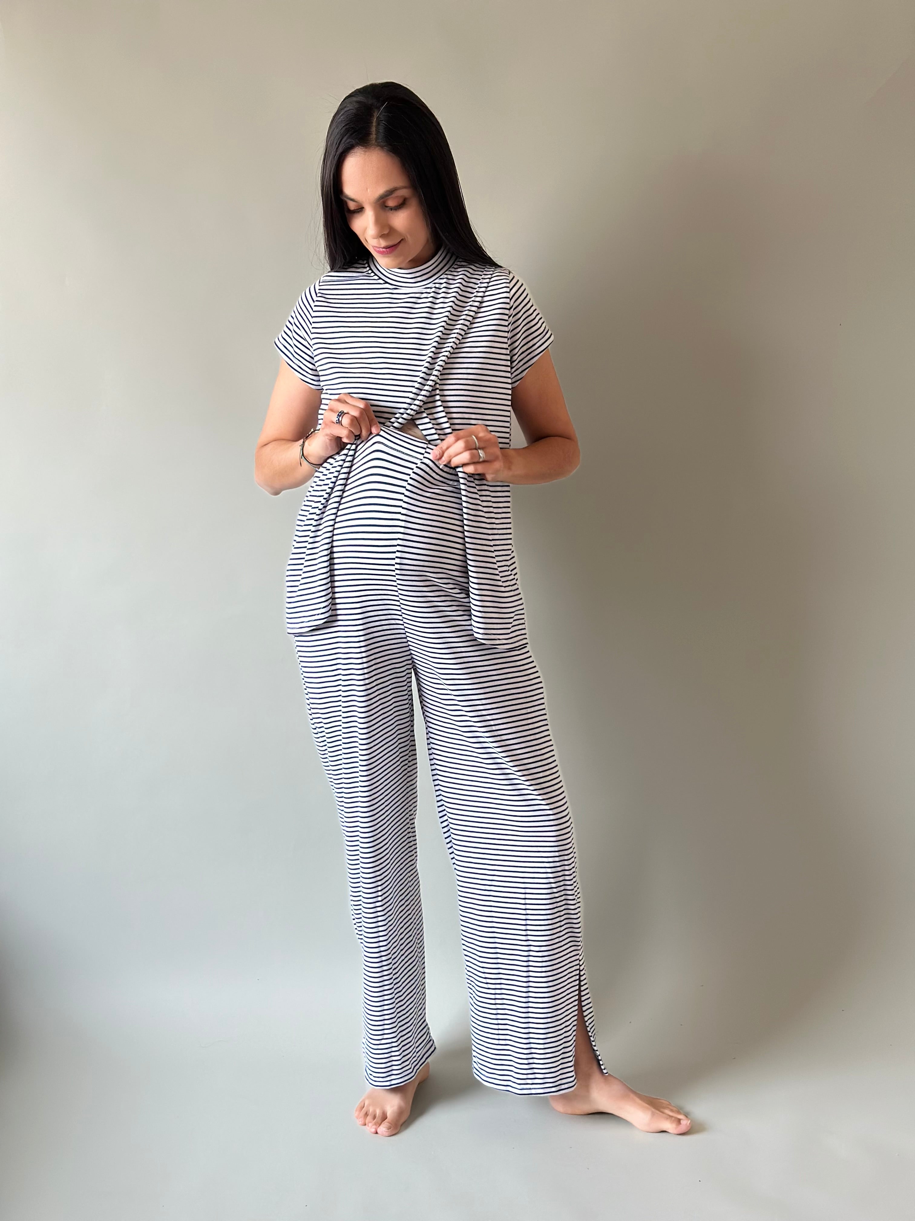 Blusa de corte holgado con fácil acceso al frente para lactancia y pantalón recto holgado con elástico en la cintura para que lo uses todo el tiempo en postparto.